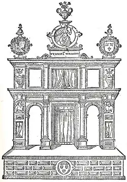 Scène sur lequel furent montés les jeux du Landjuweel de Gand en 1539. Illustration de la publication des moralités (spelen van sinne).