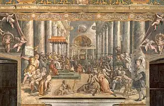 L'épisode du couronnement de Charlemagne par Léon III, qui a historiquement eu lieu la veille de Noël de l'an 800 dans l'ancienne basilique Saint-Pierre au Vatican, fait probablement allusion au concordat entre le Saint-Siège et le royaume de France signé en 1515 à Bologne. Le pape a les traits de Léon X et l'empereur ceux de François Ier, roi de France au moment de la réalisation de la fresque[28]. L'intervention directe du maître est très rare, la rédaction picturale étant presque entièrement dévolue aux élèves.