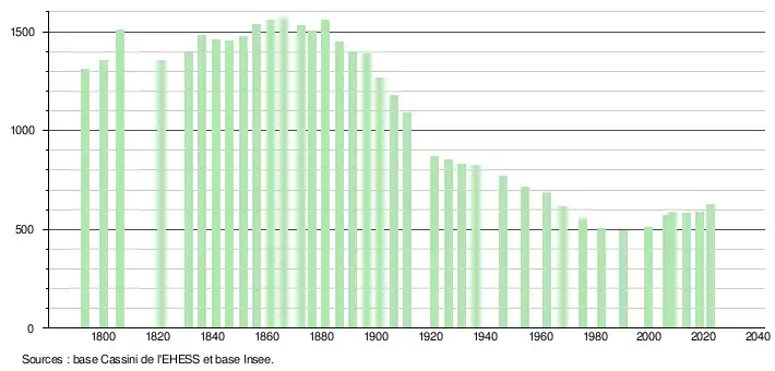 L'évolution du nombre d'habitants est connue à travers les recensements de la population effectués dans la commune depuis 1793. Pour les communes de moins de 10 000 habitants, une enquête de recensement portant sur toute la population est réalisée tous les cinq ans, les populations de référence des années intermédiaires étant quant à elles estimées par interpolation ou extrapolation[19]. Pour la commune, le premier recensement exhaustif entrant dans le cadre du nouveau dispositif a été réalisé en 2008[20].
