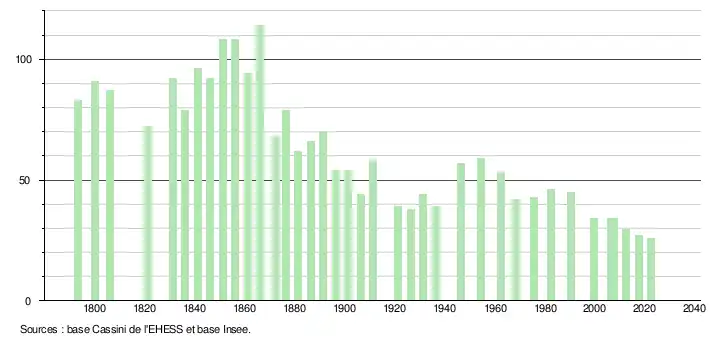 L'évolution du nombre d'habitants est connue à travers les recensements de la population effectués dans la commune depuis 1793. Pour les communes de moins de 10 000 habitants, une enquête de recensement portant sur toute la population est réalisée tous les cinq ans, les populations de référence des années intermédiaires étant quant à elles estimées par interpolation ou extrapolation[26]. Pour la commune, le premier recensement exhaustif entrant dans le cadre du nouveau dispositif a été réalisé en 2007[27].