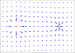 Illustration des vecteurs de champ électrique (en bleu) entre une charge positive (en rouge) et une charge négative (en vert).