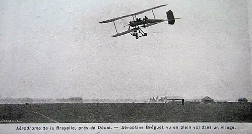 - 1909 le le Breguet type 1 décolle du Champ d'aviation de la Brayelle, il s'agit d'un biplan classique à voilure sesquiplan, munis de skis d'atterrissage, propulsé par un V8 Renault monté à l'avant entraînant une tripale métallique, des chaînes permettent de modifier l'incidence de l'aile.