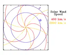 Le vent solaire est un plasma composé de particules ionisées accélérées par le Soleil et s'éloignant de ce dernier à des vitesses supersoniques, voire relativistes[5],[6]. Cela fait en sorte que le vent solaire peut porter des lignes de champs magnétiques[7]. La pression magnétique dominante de l'étoile, conjuguée à la rotation du Soleil, fait en sorte qu'il domine la plus grande partie de l'héliosphère sous la forme d'une spirale[8][réf. à confirmer],[9].
