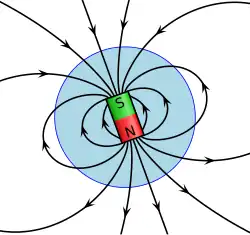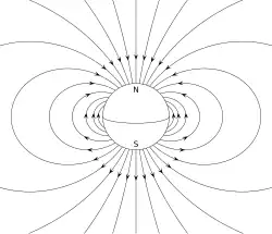 Le champ magnétique terrestre peut être comparé, en première approximation, à celui d'un aimant droit (ou d'un dipôle magnétique, ou d'une bobine plate parcourue par un courant électrique), de moment magnétique[12] 7,7 × 1022 A m2 en 2000. Le point central de cet aimant n'est pas exactement au centre de la Terre, il se trouve à quelques centaines de kilomètres du centre géométrique. Cette approximation ne doit pas faire oublier que le champ a des composantes multipolaires dont l'intensité, bien que beaucoup plus faible que la composante dipolaire, n'est pas négligeable, notamment lors d'une inversion du champ magnétique terrestre qui voit l'affaiblissement de l'intensité du dipôle si bien que les composantes non dipolaires deviennent prédominantes[13].