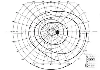 Le champ visuel de chaque œil, bien qu'étant par définition un volume (un cône de révolution), peut être représenté sur une section plane perpendiculaire à l'axe optique. On reporte les mesures de sensibilité sur un diagramme plan (fig. 1) ayant pour centre le point de fixation, duquel partent 24 rayons (les méridiens) et autour duquel s'articulent des cercles concentriques, tous les 10° (les parallèles). L'angle des méridiens avec l'horizontale est l'angle polaire α, tandis que l'angle solide des parallèles définit l'angle visuel θ ou excentricité[N 1].