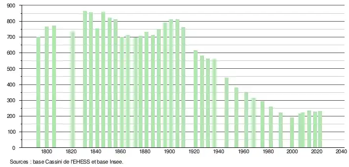 | L'évolution du nombre d'habitants est connue à travers les recensements de la population effectués dans la commune depuis 1793. Pour les communes de moins de 10 000 habitants, une enquête de recensement portant sur toute la population est réalisée tous les cinq ans, les populations de référence des années intermédiaires étant quant à elles estimées par interpolation ou extrapolation[20]. Pour la commune, le premier recensement exhaustif entrant dans le cadre du nouveau dispositif a été réalisé en 2008[21]. En 2022, la commune comptait 230 habitants[Note 3], en évolution de −3,77 % par rapport à 2016 (Corrèze : −0,59 %, France hors Mayotte : +2,11 %). |