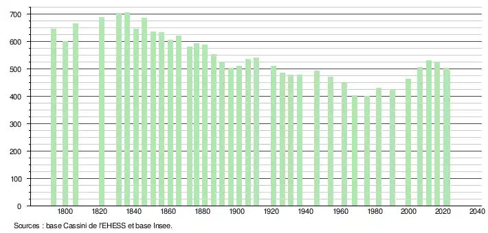 L'évolution du nombre d'habitants est connue à travers les recensements de la population effectués dans la commune depuis 1793. Pour les communes de moins de 10 000 habitants, une enquête de recensement portant sur toute la population est réalisée tous les cinq ans, les populations de référence des années intermédiaires étant quant à elles estimées par interpolation ou extrapolation[14]. Pour la commune, le premier recensement exhaustif entrant dans le cadre du nouveau dispositif a été réalisé en 2006[15].