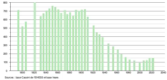L'évolution du nombre d'habitants est connue à travers les recensements de la population effectués dans la commune depuis 1793. Pour les communes de moins de 10 000 habitants, une enquête de recensement portant sur toute la population est réalisée tous les cinq ans, les populations de référence des années intermédiaires étant quant à elles estimées par interpolation ou extrapolation[14]. Pour la commune, le premier recensement exhaustif entrant dans le cadre du nouveau dispositif a été réalisé en 2006[15].