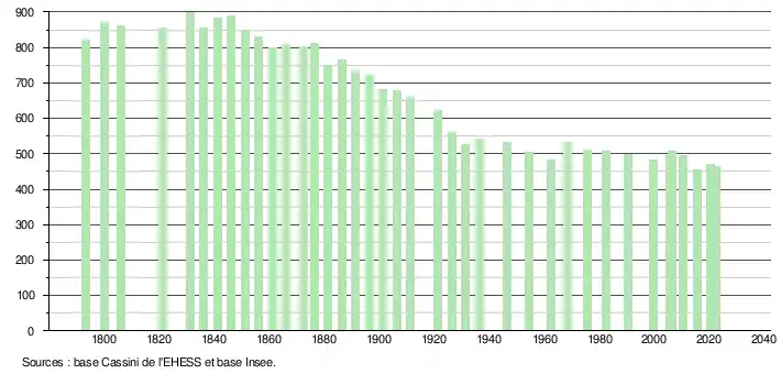 L'évolution du nombre d'habitants est connue à travers les recensements de la population effectués dans la commune depuis 1793. Pour les communes de moins de 10 000 habitants, une enquête de recensement portant sur toute la population est réalisée tous les cinq ans, les populations de référence des années intermédiaires étant quant à elles estimées par interpolation ou extrapolation[25]. Pour la commune, le premier recensement exhaustif entrant dans le cadre du nouveau dispositif a été réalisé en 2005[26].