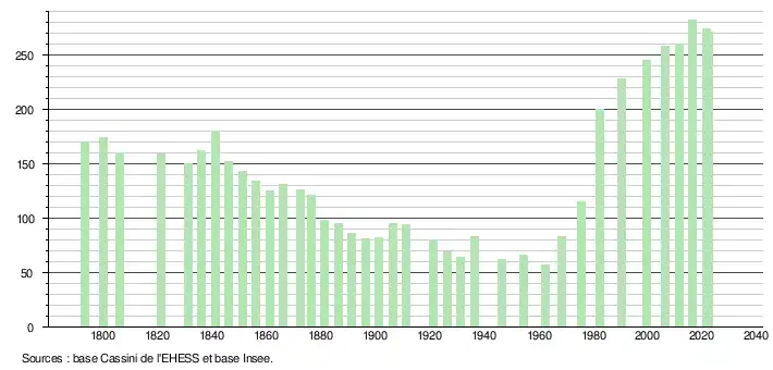 L'évolution du nombre d'habitants est connue à travers les recensements de la population effectués dans la commune depuis 1793. Pour les communes de moins de 10 000 habitants, une enquête de recensement portant sur toute la population est réalisée tous les cinq ans, les populations de référence des années intermédiaires étant quant à elles estimées par interpolation ou extrapolation[19]. Pour la commune, le premier recensement exhaustif entrant dans le cadre du nouveau dispositif a été réalisé en 2006[20].