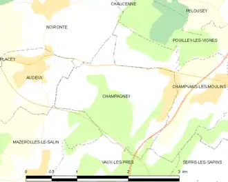 - ↑ « Orthodromie entre Champagney et Dannemarie-sur-Crète », sur fr.distance.to (consulté le ).