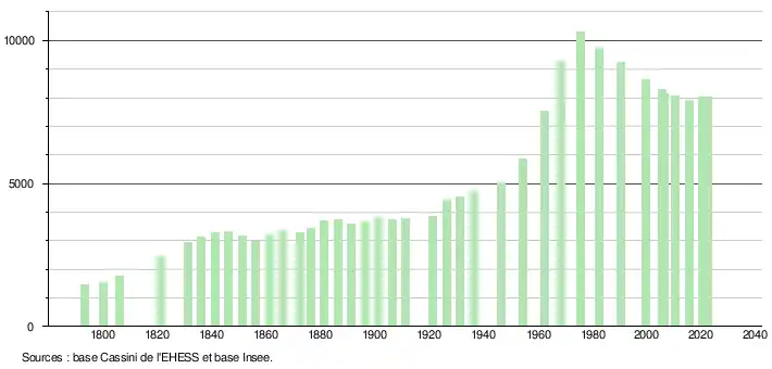 - ↑ Population municipale de référence en vigueur au 1er janvier 2025, millésimée 2022, définie dans les limites territoriales en vigueur au 1er janvier 2024, date de référence statistique : 1er janvier 2022.