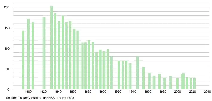 L'évolution du nombre d'habitants est connue à travers les recensements de la population effectués dans la commune depuis 1793. Pour les communes de moins de 10 000 habitants, une enquête de recensement portant sur toute la population est réalisée tous les cinq ans, les populations de référence des années intermédiaires étant quant à elles estimées par interpolation ou extrapolation[12]. Pour la commune, le premier recensement exhaustif entrant dans le cadre du nouveau dispositif a été réalisé en 2007[13].
