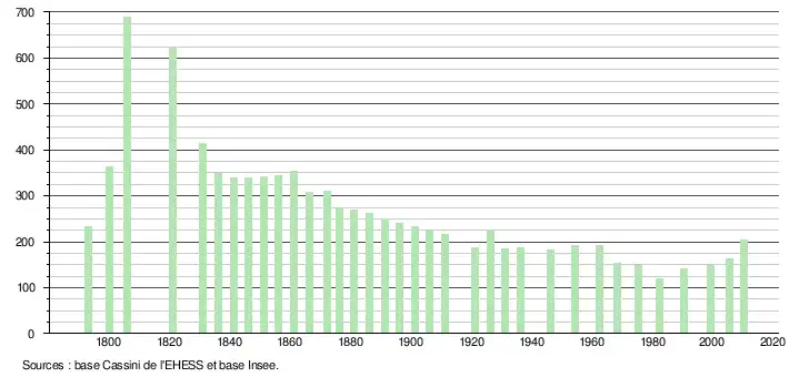 - ↑ Dans le tableau des recensements et le graphique, par convention dans Wikipédia, le principe a été retenu, pour les populations légales postérieures à 1999 de n’afficher dans le tableau des recensements et le graphique que les populations correspondant à l'année 2006, première population légale publiée calculée conformément aux concepts définis dans le décret no 2003-485 du 5 juin 2003, et les années correspondant à une enquête exhaustive de recensement pour les communes de moins de 10 000 habitants, ainsi que la dernière population légale publiée par l’Insee.