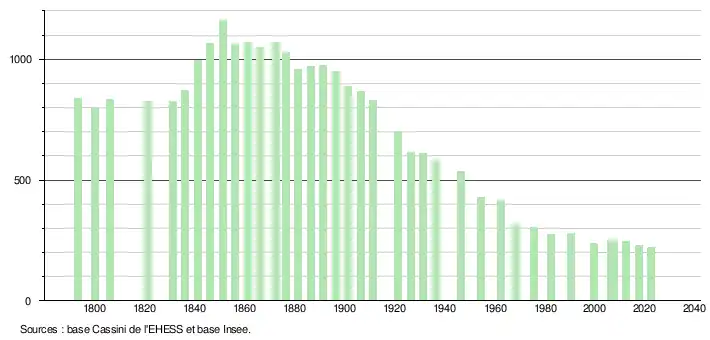 L'évolution du nombre d'habitants est connue à travers les recensements de la population effectués dans la commune depuis 1793. Pour les communes de moins de 10 000 habitants, une enquête de recensement portant sur toute la population est réalisée tous les cinq ans, les populations de référence des années intermédiaires étant quant à elles estimées par interpolation ou extrapolation[13]. Pour la commune, le premier recensement exhaustif entrant dans le cadre du nouveau dispositif a été réalisé en 2007[14].
