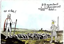 Jacques-Barthélemy Salgues (1760-1830) a écrit dans son ouvrage intitulé Des Erreurs et des préjugés répandus dans la société[8], à l'entrée « Champenois », un article particulier où il se fait cette question : Quatre-vingt-dix-neuf moutons et un Champenois font-ils cent bêtes ?[9]. Une société d’édition de cartes postales (CIM) s'emparant de la citation reprise en 1814 par M. Thieron, lors d'un discours à la société d'agriculture de l'Aube a émis un tirage humoristique :
