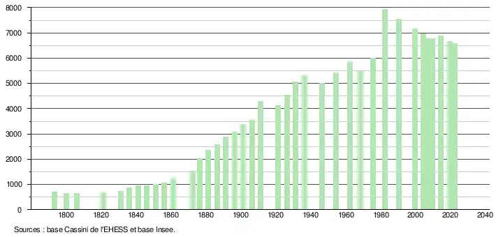 - ↑ Population municipale de référence en vigueur au 1er janvier 2025, millésimée 2022, définie dans les limites territoriales en vigueur au 1er janvier 2024, date de référence statistique : 1er janvier 2022.