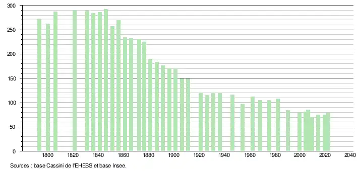 L'évolution du nombre d'habitants est connue à travers les recensements de la population effectués dans la commune depuis 1793. Pour les communes de moins de 10 000 habitants, une enquête de recensement portant sur toute la population est réalisée tous les cinq ans, les populations de référence des années intermédiaires étant quant à elles estimées par interpolation ou extrapolation[12]. Pour la commune, le premier recensement exhaustif entrant dans le cadre du nouveau dispositif a été réalisé en 2004[13].