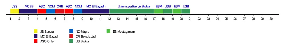 | Résultats (▼dom., ►ext.) | ASO | CRB | CSC | ESM | ESS | JSK | JSS | MCA | MCEB | MCO | NCM | OA | PAC | USB | USMA | USMK |