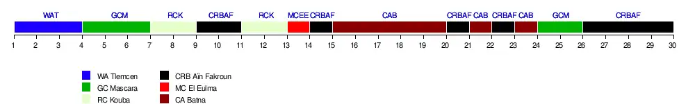 | WA Tlemcen | 0-1 | 0-1 | 1-1 | 0-0 | 0-0 | 5-1 | 1-0 | 1-0 | 0-0 | 0-2 | 1-0 | 3-1 | 1-0 | 1-1 | 2-1 | |