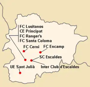 - 1 2 La fédération a permis au Sporting Club d'Escaldes de rester en Divisió 1A au terme de la saison précédente.