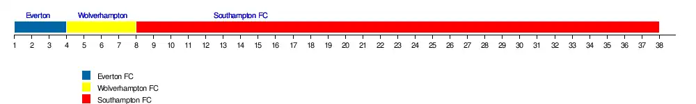 | Southampton | 16 | 16 | 19 | 19 | 18 | 19 | 19 | 19 | 20 | 19 | 20 | 20 | 20 | 20 | 20 | 20 | 20 | 20 | 20 | 20 | 20 | 20 | 20 | 20 | 20 | 20 | 20 | 20 | 20 | 20 | 20 | 20 | 20 | 20 | 20 | 20 | 20 | 20 | 36 | |