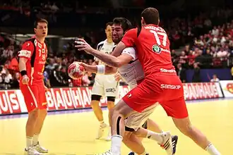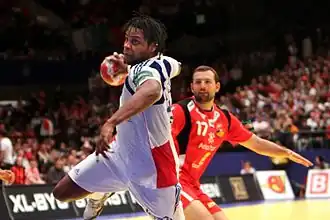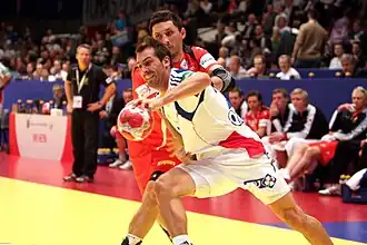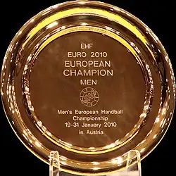 Le capitaine Jérôme Fernandez brandit le trophée du championnat d'Europe devant l'ensemble de l'équipe de France.L'équipe de Croatie, vice-championne d'Europe 2010