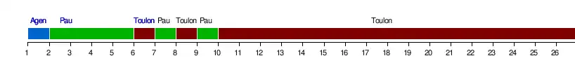 | RC Toulon | 21-50 | 19-14 | 10-20 | 13-15 | 13-20 | 9-16 | 14-36 | 8-3 | 33-9 | 16-20 | 12-25 | 11-24 | 15-18 | |