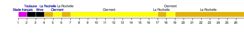 | Section paloise | 25-9 | 28-30 | 32-27 | 18-12 | 40-35 | 39-22 | 38-15 | 32-27 | 23-6 | 26-17 | 13-23 | 18-22 | 20-24 | |