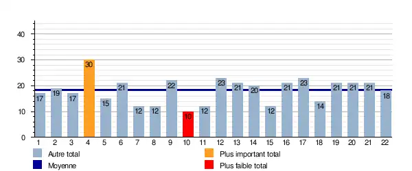 Ce graphique représente le nombre de buts marqués lors de chaque journée. Il est également indiqué la moyenne totale sur la saison qui est de 18,3 buts/journée.