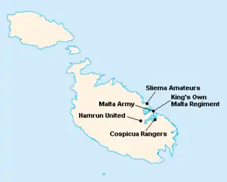 L'île de Malte étant relativement petite, les clubs évoluent tous au stade National Ta'Qali (17 400 places). Certains cependant ont leur propre enceinte qu'ils peuvent éventuellement utiliser.