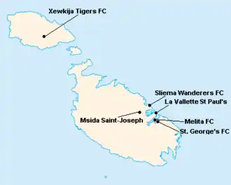 L'île de Malte étant relativement petite, les clubs évoluent tous au stade National Ta'Qali (17 400 places). Certain cependant ont leur propre enceinte qu'ils peuvent éventuellement utiliser.