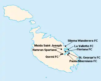 L'île de Malte étant relativement petite, les clubs évoluent tous au stade National Ta'Qali (17 400 places). Certain cependant ont leur propre enceinte qu'ils peuvent éventuellement utiliser.