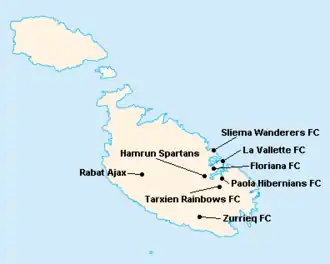 L'île de Malte étant relativement petite, les clubs évoluent tous au stade National Ta'Qali (17 400 places). Certain cependant ont leur propre enceinte qu'ils peuvent éventuellement utiliser.