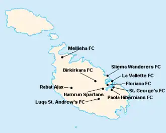 L'île de Malte étant relativement petite, les clubs évoluent tous au stade National Ta'Qali (17 400 places). Certain cependant ont leur propre enceinte qu'ils peuvent éventuellement utiliser.