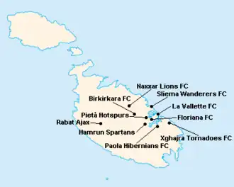 L'île de Malte étant relativement petite, les clubs évoluent tous au stade National Ta'Qali (17 400 places). Certain cependant ont leur propre enceinte qu'ils peuvent éventuellement utiliser.