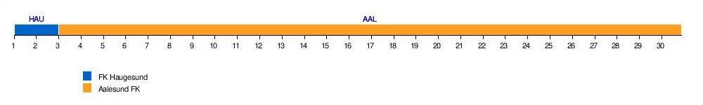 | Aalesund | 11 | 11 | 16 | 16 | 16 | 16 | 16 | 16 | 16 | 16 | 16 | 15 | 16 | 16 | 16 | 16 | 16 | 16 | 16 | 16 | 16 | 16 | 16 | 16 | 16 | 16 | 16 | 16 | 16 | 16 | 0 | 0 | 28 |