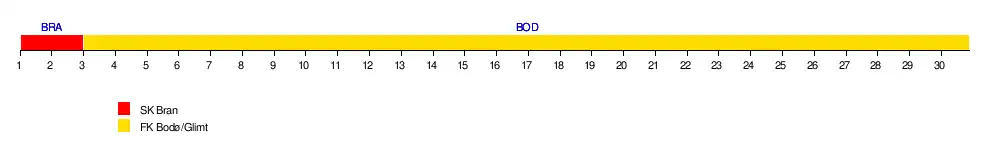 | Bodø/Glimt | 2 | 2 | 1 | 1 | 1 | 1 | 1 | 1 | 1 | 1 | 1 | 1 | 1 | 1 | 1 | 1 | 1 | 1 | 1 | 1 | 1 | 1 | 1 | 1 | 1 | 1 | 1 | 1 | 1 | 1 | 28 | 0 | 0 |