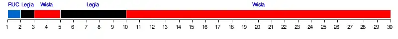 | 8. | Wisła Cracovie | 2-1 | 2-0 | 1-0 | 2-1 | 3-0 | 4-2 | 4-0 | 5-2 | 0-0 | 1-0 | 2-0 | 2-0 | 5-0 | 5-0 | 4-0 | |