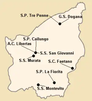 En raison du peu de nombre de stades se trouvant sur le territoire de Saint-Marin, les matchs sont joués par tirage au sort sur un des six stades suivants :