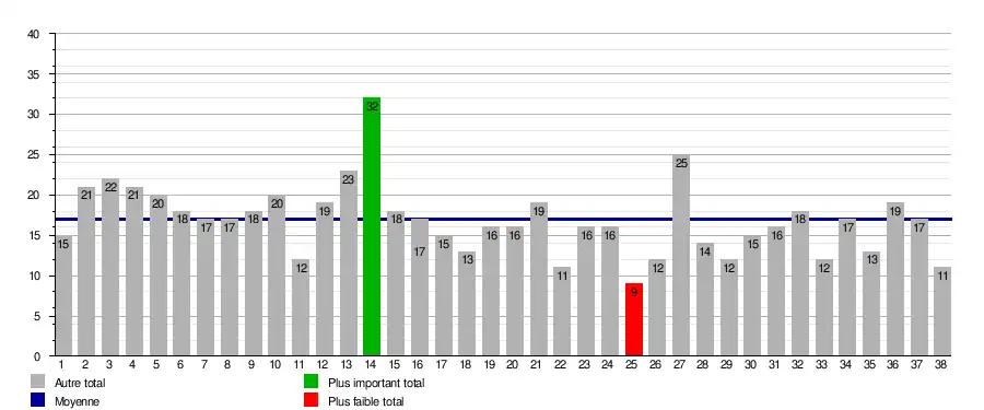 1 | 2 | 3 | 4 | 5[α] | 6 | 7 | 8 | 9 | 10 | 11 | 12 | 13 | 14 | 15 | 16[β] | 17 | 18 | 19 | 20 | 21 | 22 | 23 | 24 | 25 | 26 | 27 | 28 | 29 | 30 | 31 | 32 | 33 | 34 | 35 | 36 | 37 | 38 | 1er | bar. | rel. |