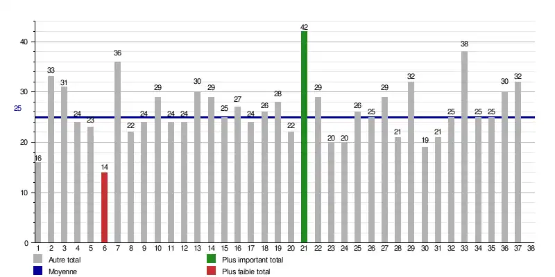 | Journée → | 1 | 2 | 3 | 4 | 5 | 6 | 7 | 8 | 9 | 10 | 11 | 12 | 13 | 14 | 15 | 16 | 17 | 18 | 19 | 20 | 21 | 22 | 23 | 24 | 25 | 26 | 27 | 28 | 29 | 30 | 31 | 32 | 33 | 34 | 35 | 36 | 37 | 38 | Journées en tête | Journées relégable |