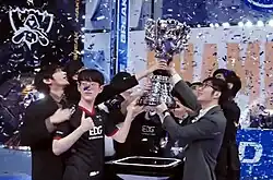 - ↑ L'équipe s'appelait à l'origine SK Telecom T1 2. Étant donné que son équipe jumelle SK Telecom T1 1 ne s'était pas qualifié pour les championnats du monde, le "2" a été enlevé du nom de l'équipe le temps de l'événement.