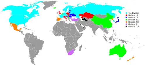 Pour les autres divisions qui comptent 6 équipes (sauf la Qualification pour la Division III), les équipes s’affrontent entre elles et, à l'issue de cette compétition, le premier est promu dans la division supérieure et le dernier est relégué dans la division inférieure. En Qualifications pour Division III, le vainqueur de la finale est promu en Division III.