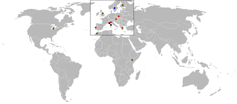 | Noir = asphalte | Marron = terre / gravier | Bleu = neige / glace | Rouge = surface mixte | ||||||||||