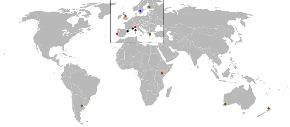 | Noir = Asphalte | Marron = Terre / Gravier | Bleu = Neige/ glace | Rouge = Surface mixte | ||||||||||