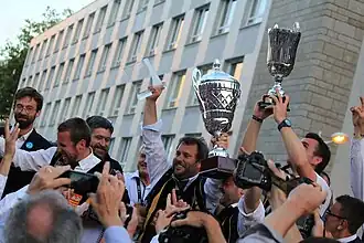 ![]() ![]() Le Bagad Kemper fêtant sa victoire, le Bagad Melinerion et la Kevrenn Alré au stade du Moustoir, le Bagad Pays des Abers et le Bagad Konk Kerne au festival de Cornouaille, et le Bagad Bro Landerne à Saint-Brieuc. |