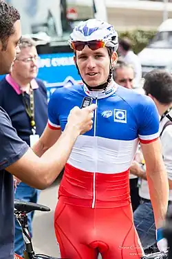 Steven Tronet arborant son maillot de champion de France sur route lors du Grand Prix de la ville de Pérenchies 2015.