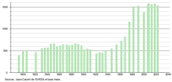 L'évolution du nombre d'habitants est connue à travers les recensements de la population effectués dans la commune depuis 1793. Pour les communes de moins de 10 000 habitants, une enquête de recensement portant sur toute la population est réalisée tous les cinq ans, les populations de référence des années intermédiaires étant quant à elles estimées par interpolation ou extrapolation[15]. Pour la commune, le premier recensement exhaustif entrant dans le cadre du nouveau dispositif a été réalisé en 2007[16].