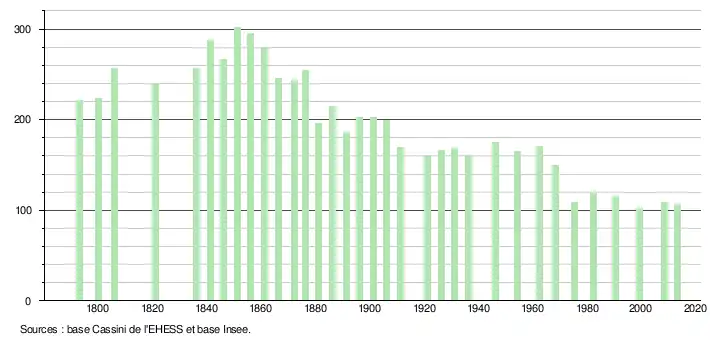 - ↑ Dans le tableau des recensements et le graphique, par convention dans Wikipédia, le principe a été retenu, pour les populations légales postérieures à 1999 de n’afficher dans le tableau des recensements et le graphique que les populations correspondant à l'année 2006, première population légale publiée calculée conformément aux concepts définis dans le décret no 2003-485 du 5 juin 2003, et les années correspondant à une enquête exhaustive de recensement pour les communes de moins de 10 000 habitants, ainsi que la dernière population légale publiée par l’Insee.